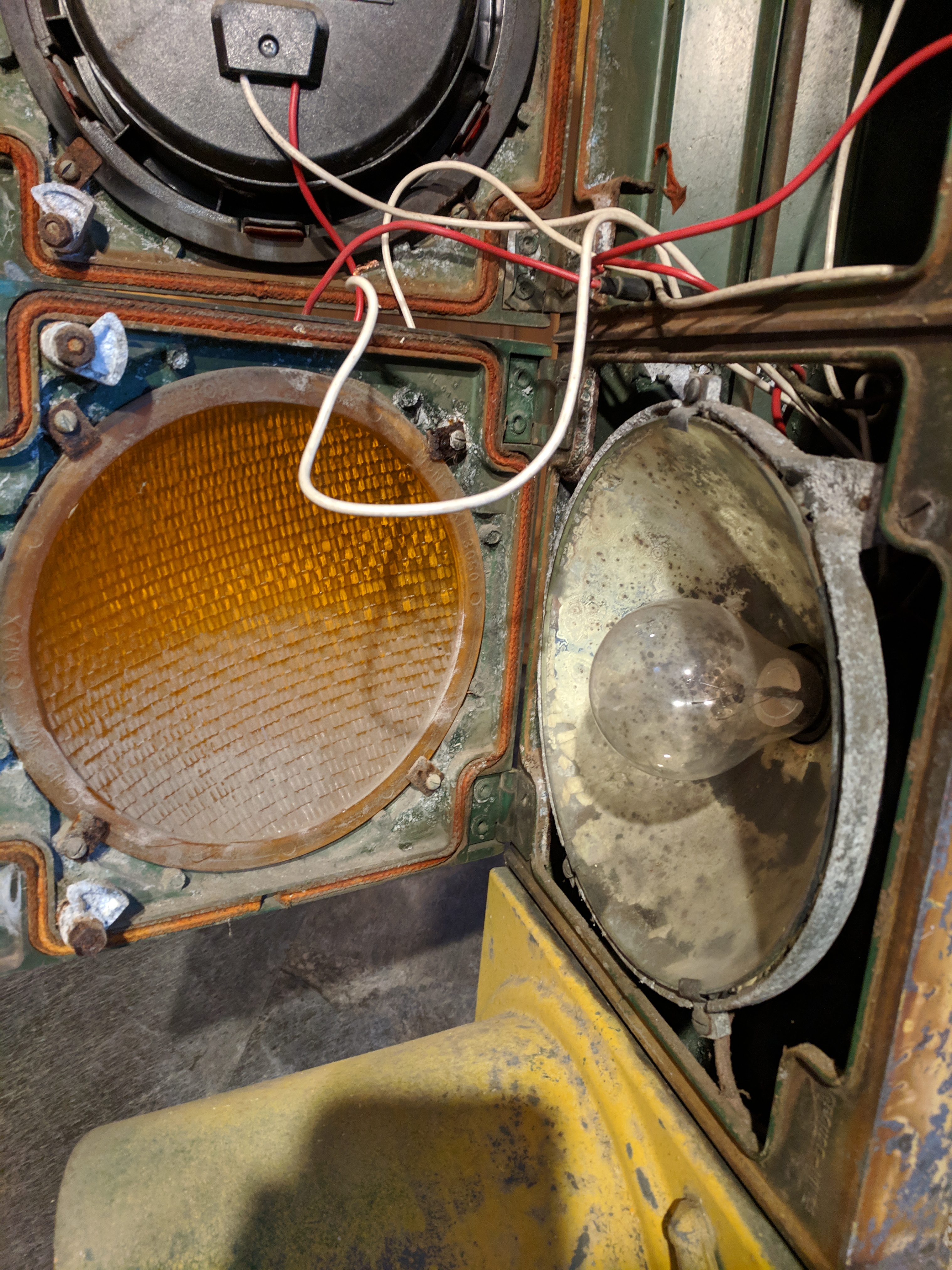 More Utica, NY stuff I picked up in November 2018. I got parts and pieces from a local intersection. The controller was up on Lincoln Ave Utica, NY in front of Holy Trinity Church since some time in the 60’s I think and there was also a Crouse Hinds Art Deco single signal I got. That’s from probably the 1940’s. Was green and painted yellow along the way.