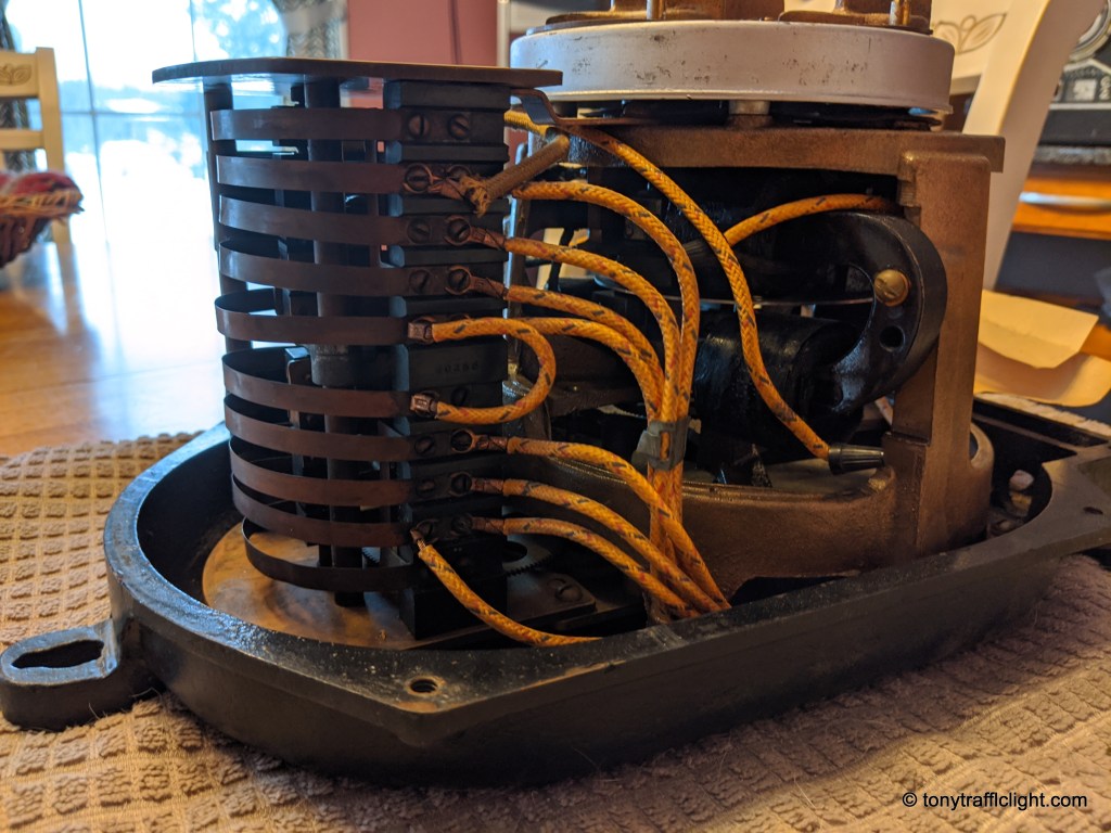 For the time period it was from (probably mid to late 1920’s) its a great piece of engineering actually. Has 3 separate coils and magnets. 1 for the Amber (yellow) time sequence, one for North-South Green / East-West Red Sequence, and the other for East-West Green / North-South Red. The way I figure how it works: