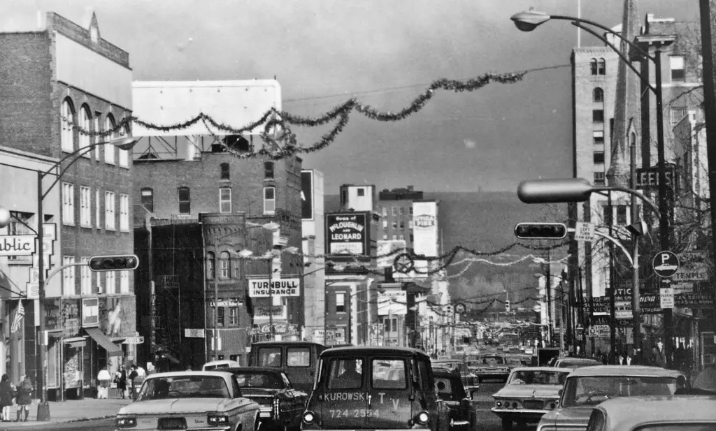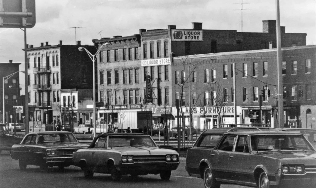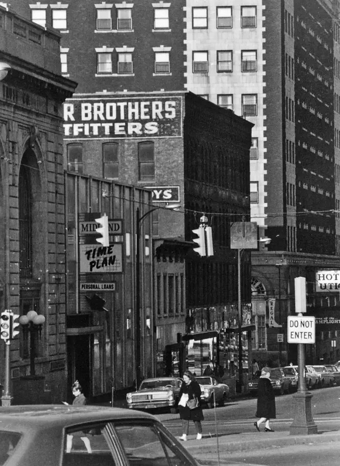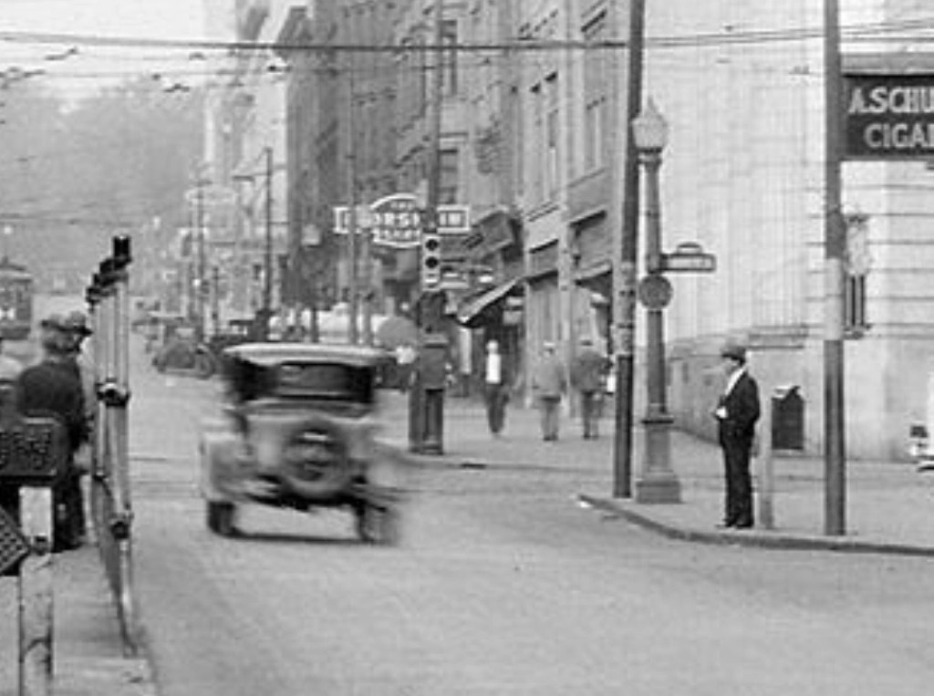 Nice looking signal mounted on the pole. There were many of these until Utica got into the span wire setup for hundreds of intersections in the city. Building still there. Really cute looking enamel street sign also. I had one as a kid. Which it was still around today. They’re very hard to find. (hint hint at anyone reading this who has one)