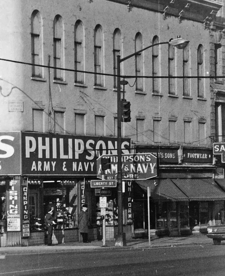 A nice setup and some Crouse Hinds signals on pedestals. Only 1 intersection remains with any type of signals like those. This was a 5 way intersection and the street with the Do Not Enter sign, Seneca Street was cut off and made into a pedestrian walkway in the 1980’s I believe. All these signals are long gone too.