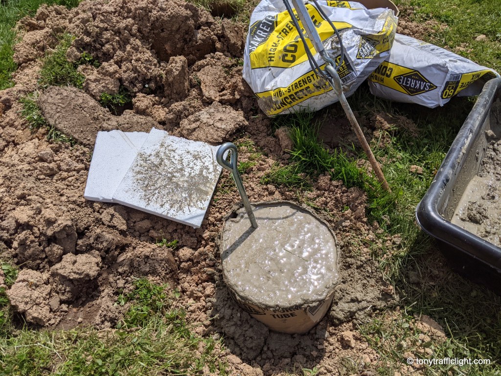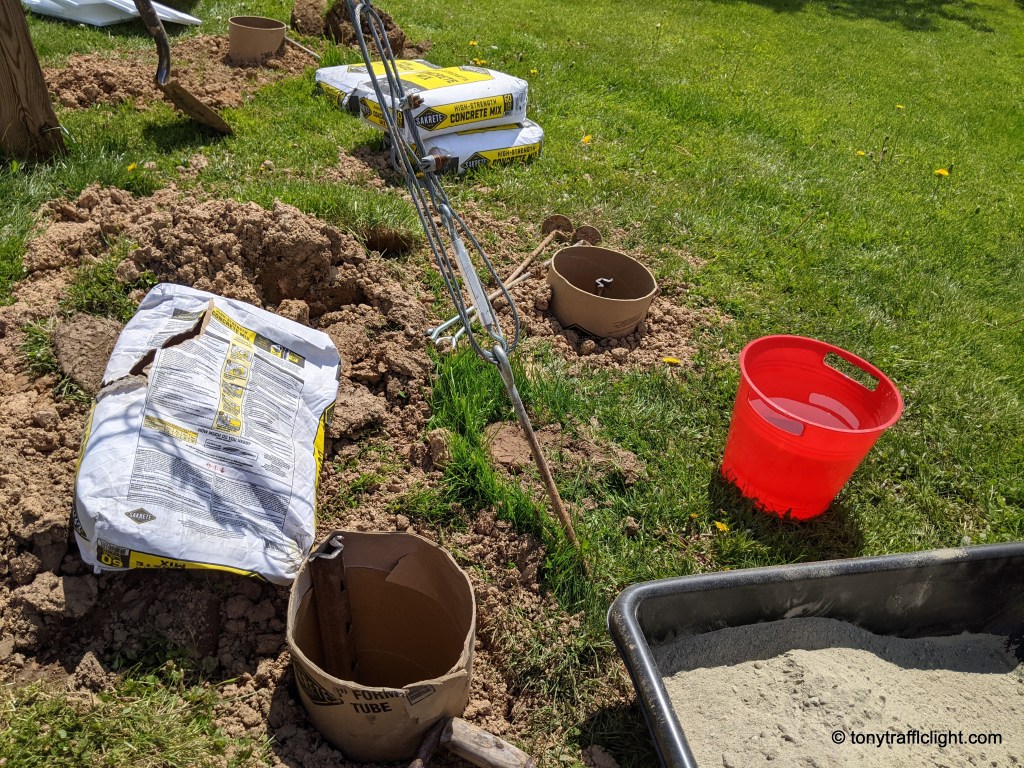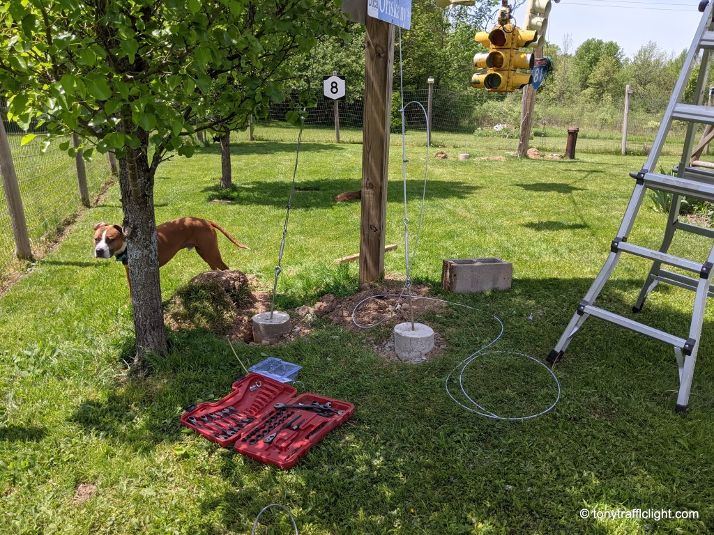 Took us a couple of hours. Of course it was a really warm day for once, but we got it all fixed. Poles are nice and straight now. Middle signal is over 7′ off the ground. Last year we were happy when we fixed it and it was 6 feet. The 2 single end signals are over 8 feet from ground level now also. Now I don’t have to duck when I’m mowing the grass, though I did the first few times I did since this was fixed.